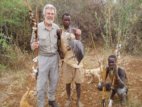 A dozen alarmed guinea fowl shot out from a tamarind tree and took off for a safer perch. Three Bushmen and their mangy mongrels took off like bats out of hell in pursuit. For five minutes Lou ran after them at a rapid clip, catching up (huff, puff) just in time to see the village chief use a single arrow to pierce the breast of one of these dumb but gorgeous black-and-white-speckled birds perched high in a sausage tree. The impaled bird did not fall out of the tree but flew off with the embedded arrow and the Bushmen ran after it - twice as far and twice as fast as before. Exhausted from his previous run, Lou tried to stay with them - crashing through the thorny acacia thicket for five more minutes - only to find himself bloodied, clothing frayed, without water and totally alone. At that point he imagined being lost forever in this arid wilderness. But what a great way to go - for he was out hunting with the Bushmen of Tanzania!