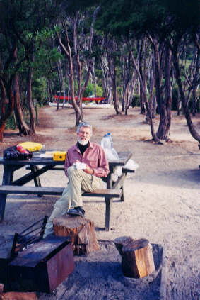 From Tonga Island we paddled back along the coastline to Bark Bay, to a campground set alongside a tidal lagoon and amidst trees with twisted trunks like those in paintings by Cezanne and Derain. We picked our way across the lagoon on sandbars to Bark Bay Hut, reserved for trampers on the Abel Tasman Track. The hut's outdoor shower is set in a forest of 20-foot tree ferns. No one was around to stop its use by mere campers, so we stripped and turned on the water. It was a delicious experience to bathe naked in the forest, but we had to put on insect repellent quickly after showering. Then we headed back to our campsite and kicked back for an afternoon of reading around the fire. (Note our kayaks behind Lou - hung high and dry above the tide.)