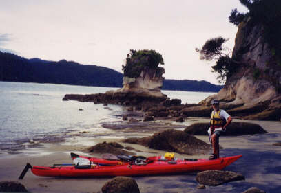 After three great tramps on some of New Zealand's best tracks, we took off our hiking boots and put on our waterproof sandals for a kayak/camping trip in Abel Tasman National Park. The park is on the north shore of New Zealand's South Island and has a spectacular, island-dotted coastline. For our two-night, three-day trip, we bought camp food in Nelson and drove an hour to Marahau, where we rented two single kayaks. We also rented a tent, one-burner cooker, waterproof camera box and sleeping mats, and purchased canisters of cooking fuel. We had a one-hour orientation on tides, weather and safety rules, then the instructor checked our kayaking skills and sent us on our way. Well, it was quite a day. After an hour of paddling, we arrived at Fisherman's Island where we had a picnic lunch with some seabirds, then got ready to shove off again (below).