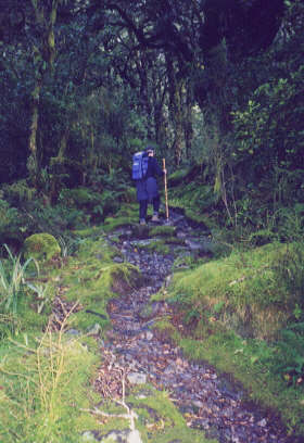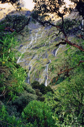 That night was cold at Falls Hut, but we were cozy in our sleep sacks - wearing clothes topped by fleece vests, jackets, pants, gloves and hats. The dozen other hikers in our bunkroom were non-snorers, so we slept well. In the morning, we hiked through sub-alpine country - rocky cliffs surrounding a large open meadow of tufted green and gold grasses, crops of lichen-covered rocks and dozens of meandering streams, each adding its own notes in stereophonic concert. We were beginning to think that last week's Milford Track is only the second best walk in the world. From the top of Conical Hill, we enjoyed a 360-degree panorama of snow-patched mountains, the Hollyford River Valley and even - in the distance - the Tasman Sea. (Hikers coming toward us from the opposite direction had been caught in a half-day deluge and didn't see the spectacular views we did from the top of the trail.) From here the trail traversed the mountainside before dropping down through a moss-covered forest to McKenzie Hut, which sits alongside a small lake. We were bathed in sunshine, yet it was cool and crisp.