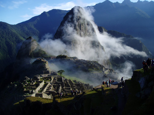The trekkers reached the Sun Gate just before sunrise on the fourth day. At first, they could see nothing but white clouds below them, but these suddenly opened to reveal the mysterious city with the dark rock of Wayna Picchu looming behind. Magical! (After the trek was over, Lou climbed Wayna Picchu - the steep trail goes up the left hand side of the mountain.)
