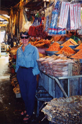 Cafes and small restaurants seemed to be everywhere. We especially enjoyed the fresh spring rolls, grilled snapper in banana leaves, and a delicious shrimp salad served in a banana blossom. Below, Joan is surrounded by dried shrimp and fish in one of the many markets. Vietnamese fish sauce is the most pungent of all; it's made of remains of rotten fish. Strangely, a few drops of it can make a dish taste delicious.....really!