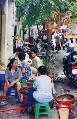 We experienced the burgeoning free market economy as soon as we taxied from the airport into Saigon - in the midst of a horrendous downpour that flooded the streets. The boulevards and narrow lanes were lined with bustling shops and filled with vendors. Coolie-hatted farmers hawked fruits and vegetables from baskets balanced on bamboo poles. Cyclos (pedal rickshaws) moved precariously under huge burdens: eight 80-pound bags of rice; or four live, trussed-up hogs; three dozen ducks, feet tied, heads hanging down, squawking indignantly. Young women pedaled their bicycles to work, (improbably, given the heat and humidity) wearing bandit-style bandanas over most of their faces and long evening gloves - the men here reputedly prefer light-skinned women. CD shops blared Asian and Western pop music, and hordes of motorbikes raced dangerously through wet streets crowded with pedestrians.