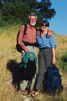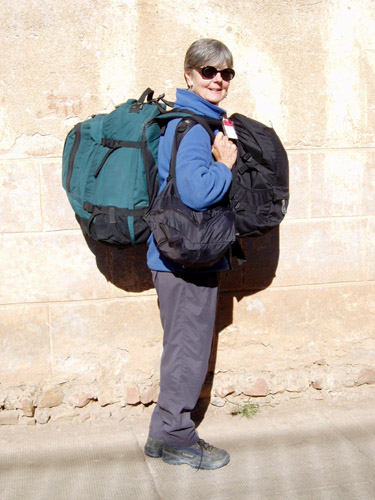 Do as we say, not as we do! During our two longest trips (8- and 10-months) we carried 45 pounds apiece - 30 on our backs and 15 more on our fronts. We looked like pack animals. This much weight is NOT recommended! (However, it was not as bad as this photo suggests. The dark shadows appear to be part of the packs - making them look gigantic!)