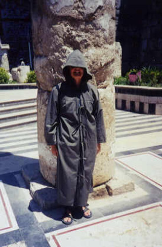 Even in her ultra-modest clothing, a mosque in Damascus was off limits to Joan unless she put on a traditional burka. It was roasting hot that day, and all the Muslim men were wearing light-weight, short-sleeved Western shirts in the mosque - while the Muslim women and Joan dripped sweat inside their heavy garments. She looks like something out of Star Wars in this photo. While she's smiling at the absurdity of it all, she was actually pretty cranky.)