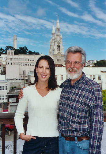 Other off-the-beaten-path places include the tiny XOX Truffles shop just across the street from our flat where one of the “top ten chocolatiers in the country” makes velvety, dark truffles the size of a thumbnail (given our weakness for chocolate, this was a serious probelm); the Art Deco house on the backside of Telegraph Hill with a life-size cut-out of Humphrey Bogart in the front window (the house was featured in “Dark Passage,” a 1947 film starring Bogie); and the steps of the church in North Beach where Joe DiMaggio and Marilyn Monroe were photographed after their wedding. (The photo below of Lou and our daughter Shanna on the roof deck shows that church, along with Coit Tower on Telegraph Hill in the background.)